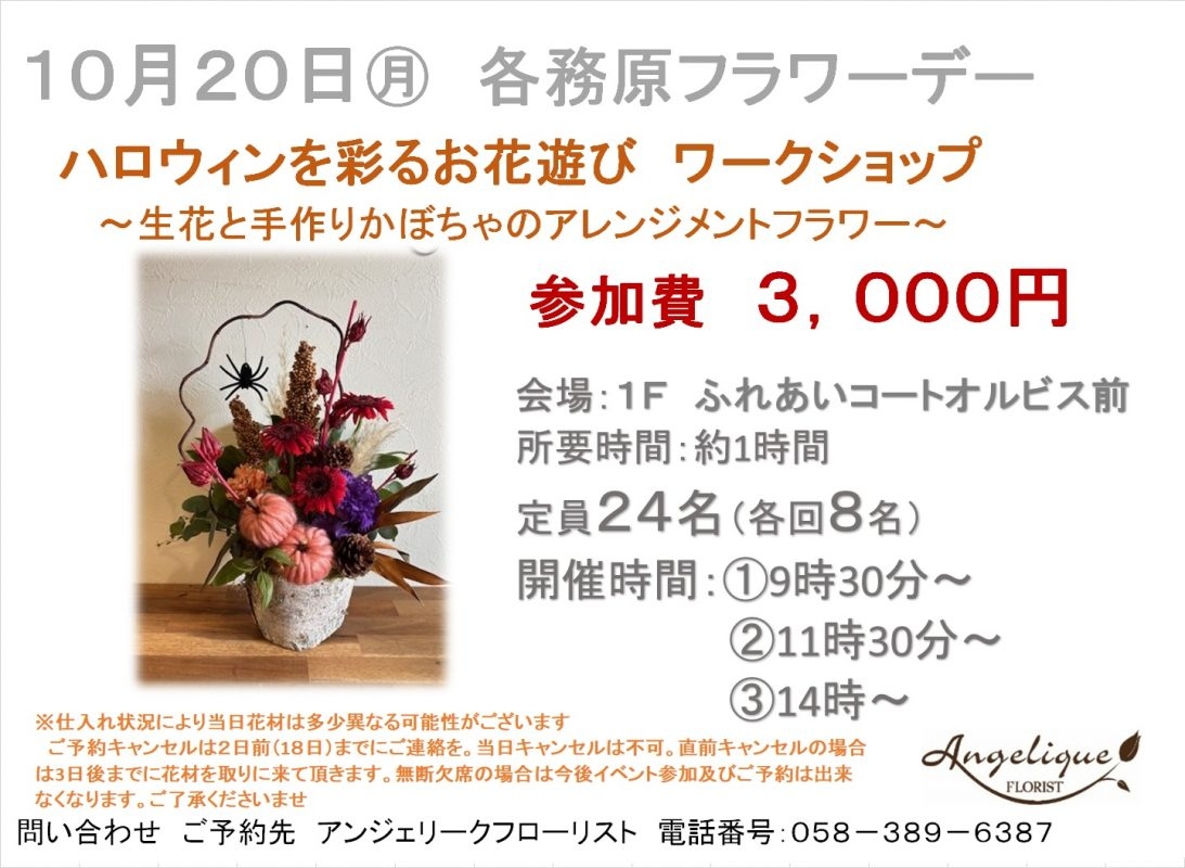 10月20日開催の各務原フラワーデー 10月は生花を使用したハロウィン アレンジメントフラワーのワークショップを開催致します。 手作りのかぼちゃを使用した季節を感じるワークショップです。 皆様のご参加…