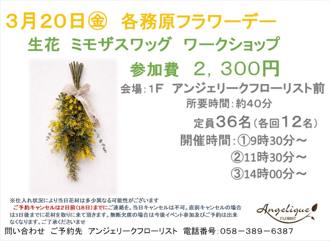 3月20日開催各務原フラワーデー 人気のミモザスワッグのワークショップです。 早くも9時半~の部は定員になっております。 皆様のご参加心よりお待ちいたしております。
