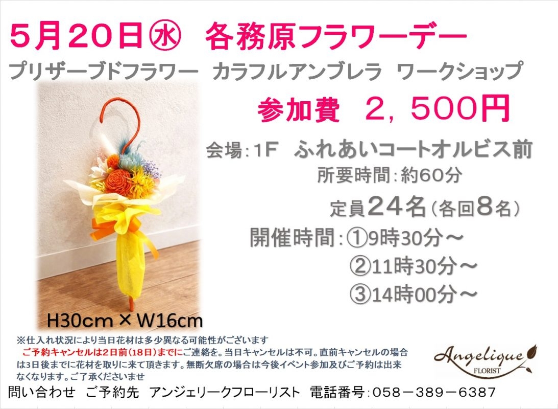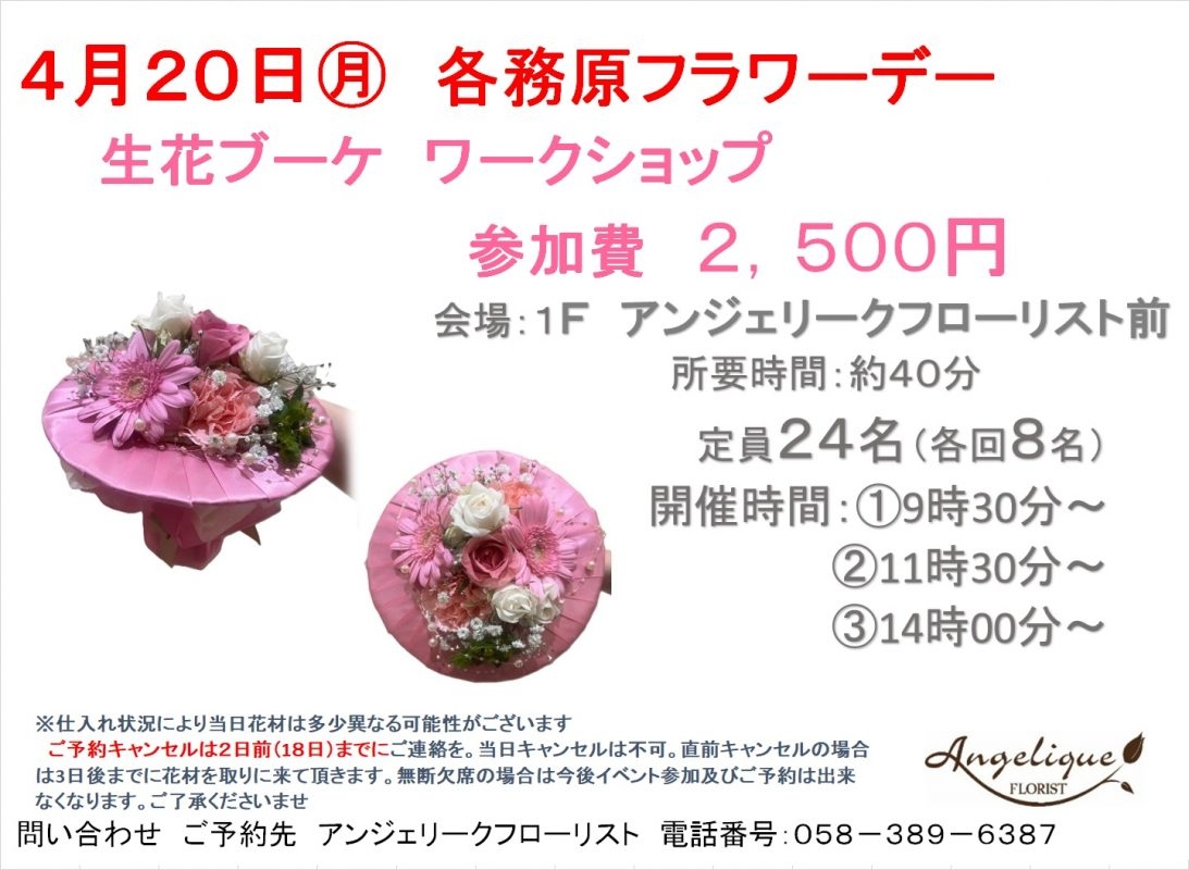 4月20日㈪開催の各務原フラワーデーは生花を使用したブーケのワークショップ 皆様のご参加心よりお待ちいたしております。