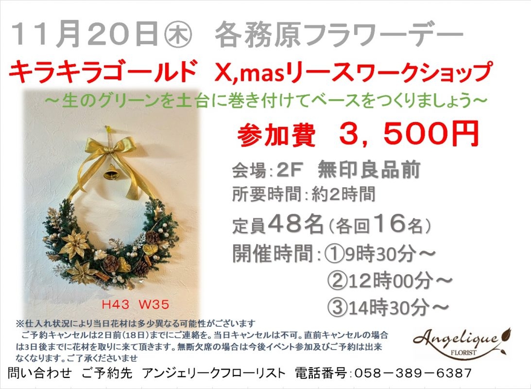 2025年10月23日 11月20日開催各務原フラワーデーのお知らせ 11月開催各務原フラワーデーは人気のクリスマスリースのワークショップです。 既に多くの方にご予約いただいております。 ご予約は店舗電話で受け付けております。 皆様のご参加心よりお待ちいたしております。